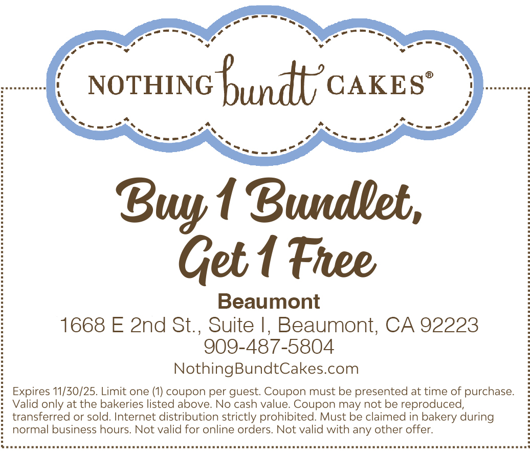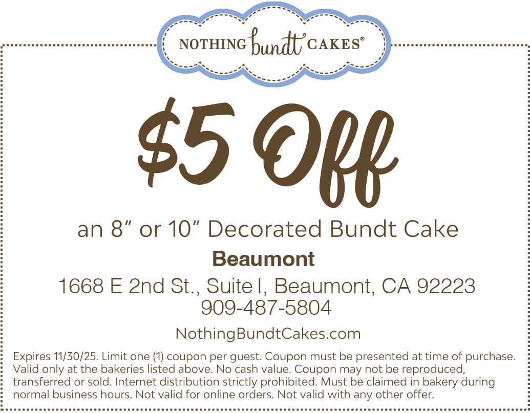 Nothing Bundt Cakes® - Beaumont, CA at 1668 E 2nd St. Suite I has been serving the Beaumont community since winter 2024. Located in a bustling area, our bakery offers a cozy atmosphere and a variety of Bundt Cakes, Bundtlets, and Bundtinis® for all occasions. Each cake is crafted with the finest ingredients, ensuring a delightful taste experience every time.